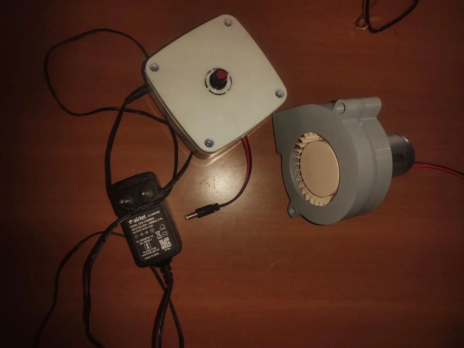 The system includes a 12V DC motor with an analog speed controller for heat tuning and a BIS-certified 2A adapter for stable,